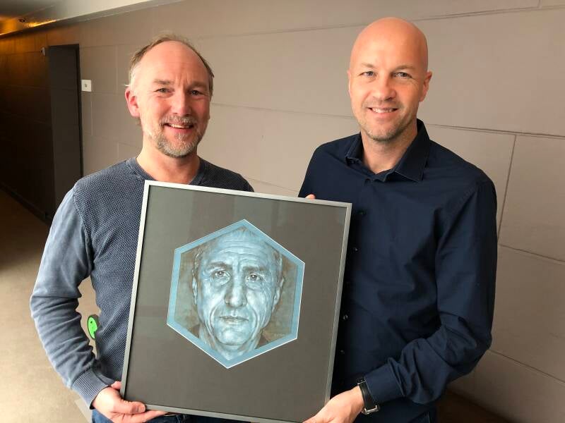 Overhandiging van het portret van Johan Cruyff aan Jordi Cruyff. Dit werk maakt deel uit van mijn serie Wall of Fame-portretten van internationale iconen