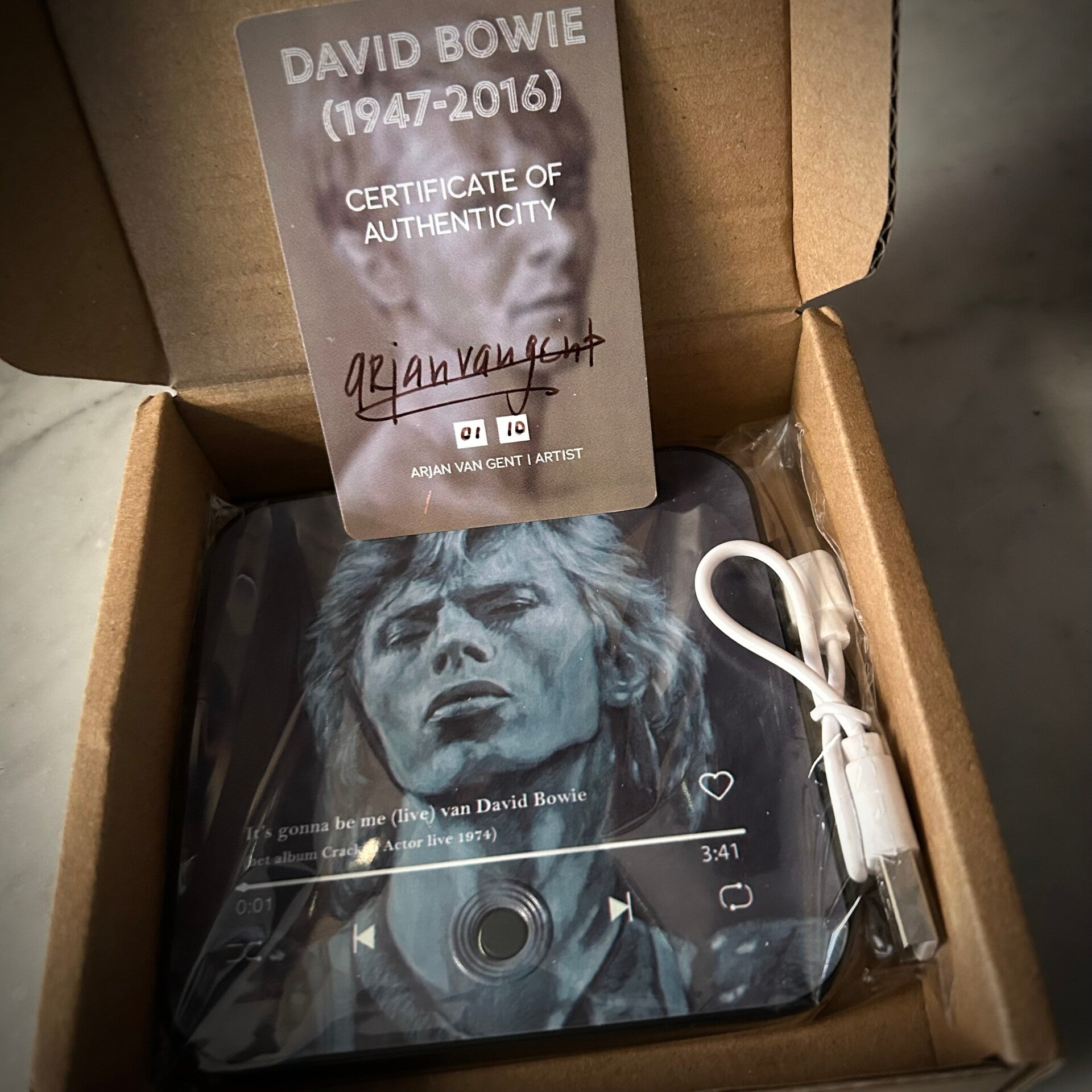 It features an original portrait of David Bowie, combined with a built-in audio fragment that plays when activated.