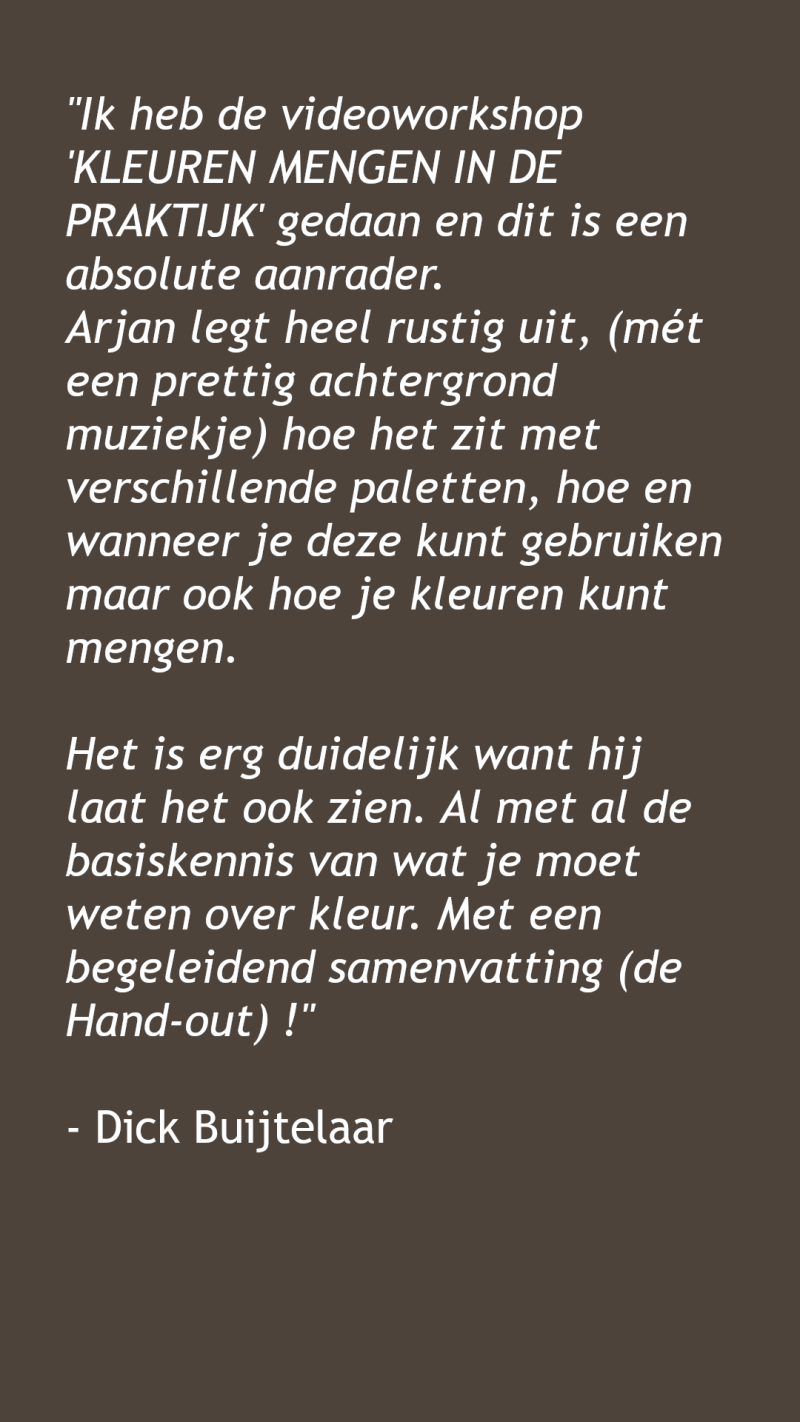 Deze workshop behandelt kleurgebruik in de kunstgeschiedenis, het belang van complementaire kleuren (-paren) en de uitvoerige demonstratie van 3 verschillende paletten (het volledige palet, het palet voor lucht- en landschap en het beperkte palet)! De duur van de video is 48 minuten en daarbij leg ik stap-voor-stap uit hoe je de kleuren mengt, welke kleuren je nodig hebt en vooral WAAROM!